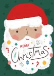 A fun and humorous Christmas card featuring a hand-drawn cute illustration of Santa Claus with stuff stuck in his beard, such as baubles, candy canes, holly and stars.