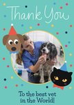 From of Card: Bright graphic illustration of the heads of a cat and a dog, surrounded by different coloured spots. Text reads: "Thank You To The Best Vet In The World!" With editable text and photo.