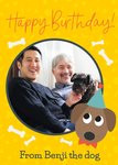 Scatterbrain yellow graphic pattern on a yellow background, with a small illustration of a dog in the bottom right hand corner with six bones, plus a photo upload option in a circular frame. The non editable caption reads Happy Birthday, with the editable part reading From Benji The Dog