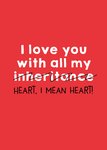 A humorous red greeting card with bold white and black text playfully crossing out “inheritance” and replacing it with “heart.”