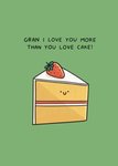 Featuring a sweet and playful design with a green background. The main illustration is an adorable slice of cake with a smiling face, topped with a strawberry. Above the cake, there is black, handwritten-style text. The message combines humour and affection, making it a fun and endearing way to express love for a grandmother. The simple yet charming design, along with the warm sentiment, adds to the card's overall appeal, perfect for a lighthearted and loving gesture.