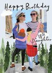 This Scribbler greeting card features a light blue background with illustrated figures standing on a rock surrounded by trees, and a central rectangular photo upload area.