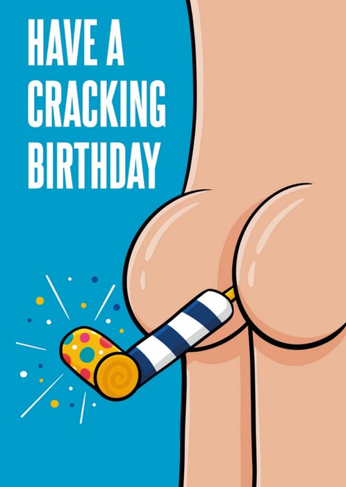 Featuring an illustration of a person's bare buttocks, humorously depicted with a brightly coloured party blower inserted between the cheeks. The party blower is exploding with confetti-like decorations. To the left of the image, bold white text on a blue background, playing on the word "cracking" as a pun related to both the explosion of the party blower and the person's behind. The style is cartoonish and lighthearted.