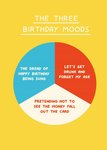 "The three birthday moods", "the dread happy birthday being sung", "let’s get drunk and forget my age" and "pretending not to see the money fall out of the card".
