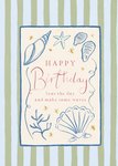 Front of card: Featuring a rectangular frame on a olive green striped background. In the centre of the card are illustrations of shells and coral and text. Text reads: "Happy Birthday. Seas the day and make some waves".