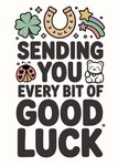 Featuring a bold good luck message with cute lucky icons including a horseshoe, four-leaf clover, shooting star, ladybird and beckoning cat, on a crisp white background.