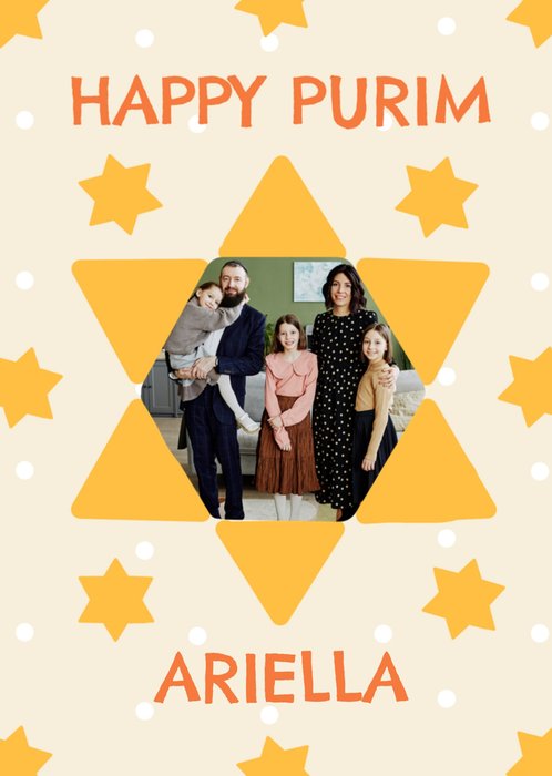 A vibrant and celebratory Photo Upload Purim card, in the centre, prominently displayed, are the words "Happy Purim" in large, bold letters, drawing immediate attention. In the centre of the design is a striking representation of the Star of David, positioned as the focal point of the card, this acts as the photo upload area, allowing you to upload an image that will sit in the middle of the star. The Star of David is bold and eye-catching, emphasising the holiday's significance. Additionally, the card's background is adorned with numerous smaller stars, all coloured in a cheerful shade of yellow, evoking a sense of joy and festivity. Among these stars, scattered throughout the background, are small white dots, adding further visual interest and depth to the design. Overall, the card captures the essence of Purim with its vibrant colours, festive imagery, and heartfelt message.