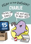 Text reads: "Relax on your Birthday Charlie." With speech bubbles 'You're up early!' "I've not been to bed yet!"