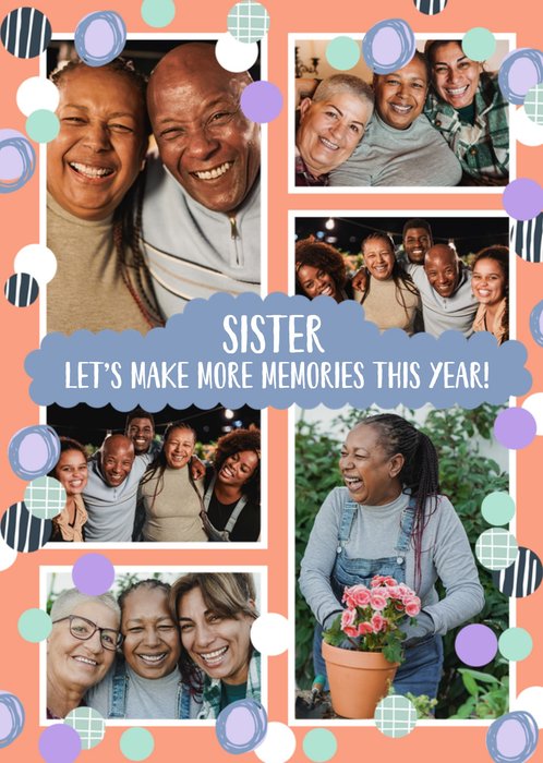 Featuring a collage of six photo frames surrounded by colourful circle patterns on a peach coloured background.