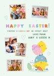 Featuring funny hand-illustrated pair of baby chicks playing with Easter eggs, one has half of a cracked eggshell on its head and the other stands on top of the other. There are five photo upload areas in rectangular frames.