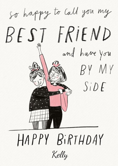Front of card: Black and pink sketchy line drawing of two girls smiling and hugging on a cream background. Black brush script message and black editable name below Text reads: "So happy to call you my BEST Friend and have you by my side. Happy Birthday Kelly." With customisable name