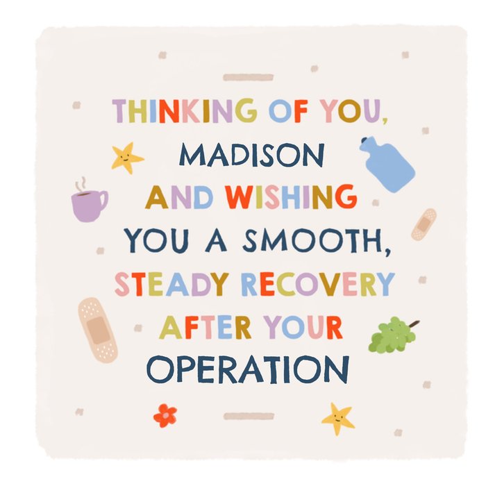 A modern design featuring colourful typographic lettering with small doodles of stars, a mug, plasters, a hot water bottle and grapes on a cream background.