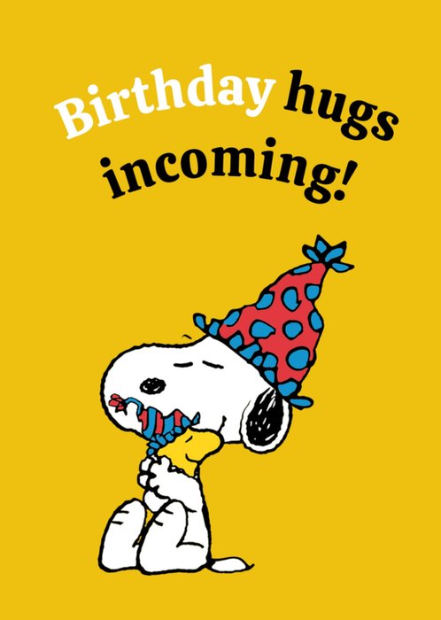 Front of card: Featuring an illustration of Snoopy & Woodstock hugging, wearing party hats, with bold curved text above, all on a mustard yellow coloured background. Text reads: "Birthday hugs incoming!"