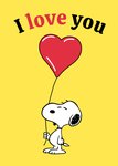 Featuring an illustration of Snoopy holding a red heart balloon, with bold curved text above, all on a yellow coloured background.