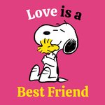 Featuring an illustration of Snoopy & Woodstock hugging with bold text above & below, all on a pink coloured background.