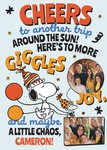 Front of card: Featuring an illustration of Snoopy and Woodstock. Text reads: "Cheers to another trip around the sun! Here’s to more giggles joy! And maybe a little chaos, Cameron!". 'Cameron!' can be personalised!