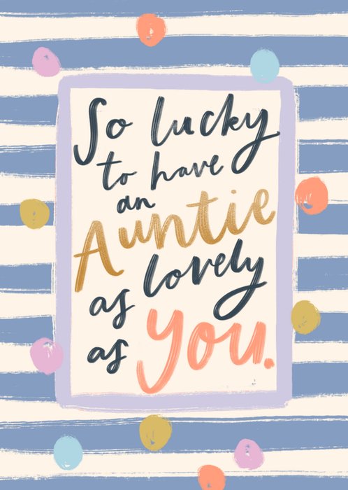 This greeting card design features a heartfelt message framed in soft lavender, with a background of blue and cream horizontal stripes, accented by scattered polka dots in pastel and warm tones.