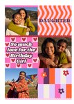 Featuring three photo frames in a modern collage layout, with a pink checkerboard, wavy orange stripes, colourful blocks and scalloped frames surrounded, by a crisp white border.