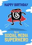 Front of card: Featuring an illustration of a social media superhero soaring through the sky. Text reads: "Happy birthday to a social media superhero".