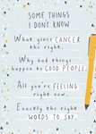 "Some things I don't know. What gives cancer the right. Why bad things happen to good people. All you're feeling right now. Exactly the right words to say."