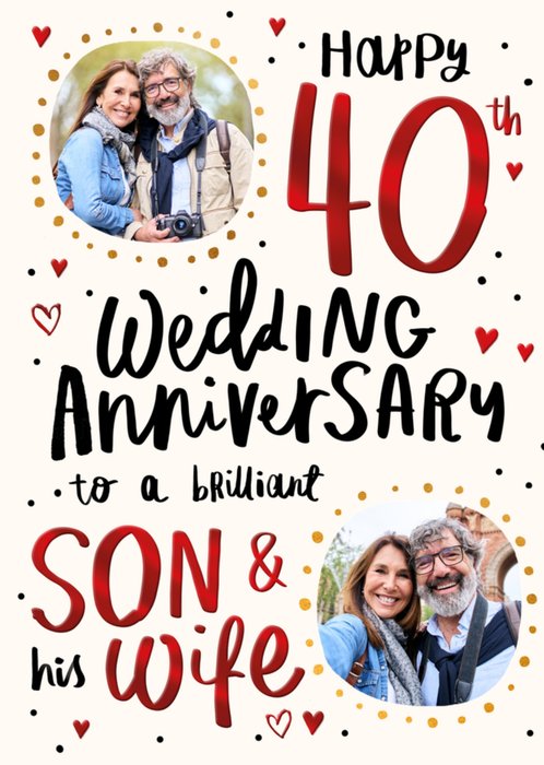 Front of card: Featuring 2 circular photo areas framed by dotted gold borders & hand-lettered black script and shimmering red typography, all on a white background scattered with red heart illustrations.br> Text reads: "Happy 40th wedding anniversary to a brilliant son & his wife."