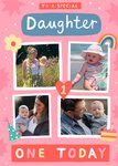 Featuring a banner above & below containing text, with 4 central photo upload frames surrounded by illustrations of a flower, party hat, a rainbow, a heart containing the number 1, & a slice of birthday cake, all on a pink background of star patterns.