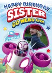 Front of card: Bold and Colourful typographic text with Images of Spider-Gwen with a large Photo Upload Text reads: "Happy Birthday Sister Go Webs Go!"