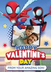 A fun and humorous Valentine's Card from a son featuring animated Spidey & Miles Morales, they are web-swinging through the city scene with one photo upload area in a frame in the centre, the characters are overlapping the frame.