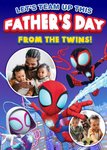 Front of card: Spidey And His Amazing Friends Photo Upload Father's Day Card Featuring Spidey, Spin and Ghost-Spider. Text reads: "Let's team up this Father's Day from the twins!".