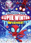 This vibrant Spidey and His Amazing Friends Christmas card design features Spider-Man, Spider-Gwen, and Miles Morales swinging through a snowy, decorated cityscape with festive lights, snowflakes, and icicles, accompanied by the cheerful message “Sending You Super Winter Wishes!” in bold, playful text.