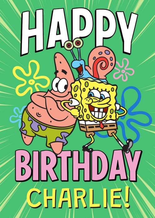 Featuring illustrated SpongeBob SquarePants, Patrick Star and Gary the Snail in a lively, colourful cartoon style. The characters appear against a bold green background with bright burst lines and simple flower shapes.