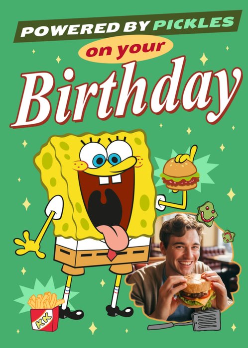 Featuring SpongeBob SquarePants holding a burger, with a single rounded photo upload frame in the bottom right corner. The scene sits on a bright green background.