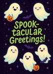 Front of card: A modern design featuring cute ghost and bat illustrations surrounding a central spooky message. The design is framed by pink and purple stars against a black background.