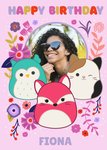 Front of card: Squishmallows Photo Upload Birthday Card Featuring various Squishmallows with a circular photo frame. Text reads: "Happy birthday Fiona". 'Fiona' can be personalised!