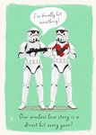 Featuring a hand-drawn illustration of two Stormtroopers with a humorous message in a speech bubble & text below, against a green & white background.