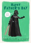 A fun Star Wars Father's Day greeting card showing Darth Vader giving a thumbs up with a glowing red lightsaber and a thought bubble, all on a bright green background.