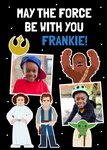 Front of card: Featuring illustrations of Chewbacca, Princess Leia, Han Solo and Yoda with two photo frames. Text reads: "May the force be with you Frankie!". All text can be personalised!