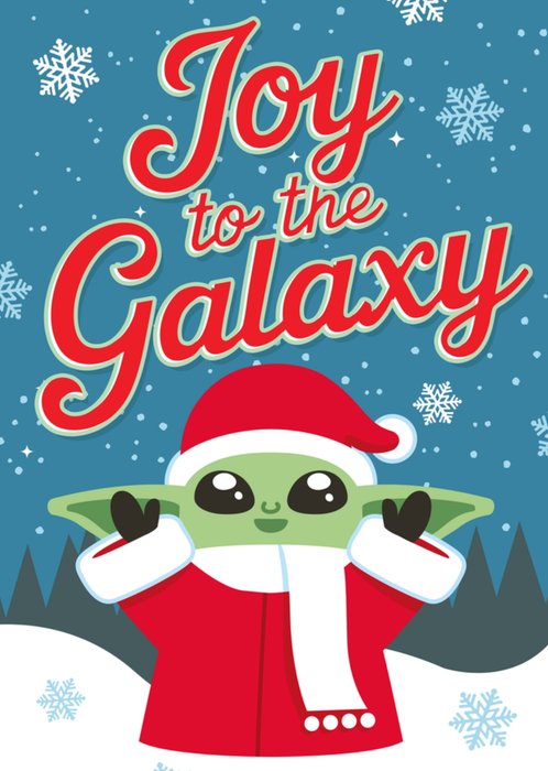 This festive ‘The Mandalorian’ greeting card design features Grogu (Baby Yoda) dressed in a red Santa outfit and white scarf, standing against a snowy backdrop with snowflakes, a blue starry sky, and the cheerful phrase “Joy to the Galaxy” in bold red and white lettering.
