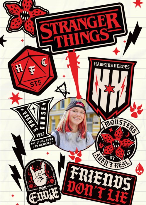 Featuring a page of a notebook covered in Stranger Things stickers, patches in red and black, and a circular photo frame on a white lined background.
