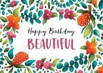 Front of card: Illustration of colourful flowers, leaves and plants around the border of card, with hand lettering in the centre Card reads: "Happy Birthday Beautiful"