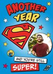 A fun and uplifting Superman birthday card with comic-style fonts, vibrant stars and a classic red-and-yellow Superman logo. Includes one circular photo upload frame, perfect for personalising with a snapshot of the birthday hero.