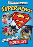 A bold, action-packed Father’s Day card with a comic book theme. It features three photo upload frames showcasing playful moments between a father and child. The design uses a bright blue background, comic-style lettering, and the iconic Superman “S” shield at the centre. White and red speech bubbles contain heartfelt text, and the layout mimics a classic superhero comic panel.