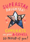 A playful greeting card featuring the words "Superstar Daughter!" above a large black-outlined star-shaped photo frame in the centre, all set against a cheerful peach-orange background.