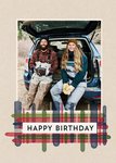 Photo upload card that sits central in the design. There is a tartan banner underneath the photo that has the non editable caption Happy Birthday. The card background is cream kraft paper.