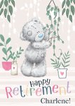 Me To You Tatty Teddy design featuring a colourful non editable caption that reads Happy Retirement, followed by the editable recipient's name. Tatty Teddy is tending to his house plants. The card background is a textured cream with white silhouettes of leaves on it.