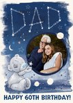 Tatty Teddy Happy 60th Birthday! Editable and Photo Upload Card. Illustration of Tatty Teddy Sat Holding Out Hands Towards Photo Upload Frame in the middle of the Card. On a blue background, surrounded b ystars, constellations and planets. Editable text at the bottom of the cards reads: "Dad Happy 60th Birthday!"