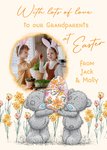 Front of card: Featuring a cute illustration of two Tatty Teddies with an easter egg and a circular photo frame. Text reads: "With lots of love to our grandparents at easter from Jack & Molly". 'Jack & Molly' can be personalised!
