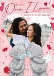 Front of card: Featuring a cute illustration of two Tatty Teddies with a large heart shaped photo frame. Text reads: "To the one I love on our anniversary".