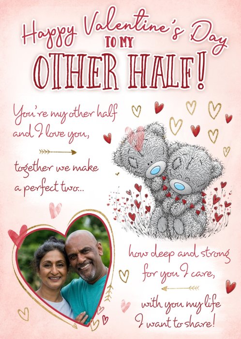 Features two Tatty Teddy bears hugging, surrounded by a heart-shaped photo upload area and sentimental verse.