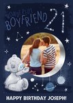 Tatty Teddy is reaching up to a photo upload framed within a sickle moon. Tatty is surrounded by planets and stars on a painted blue background.